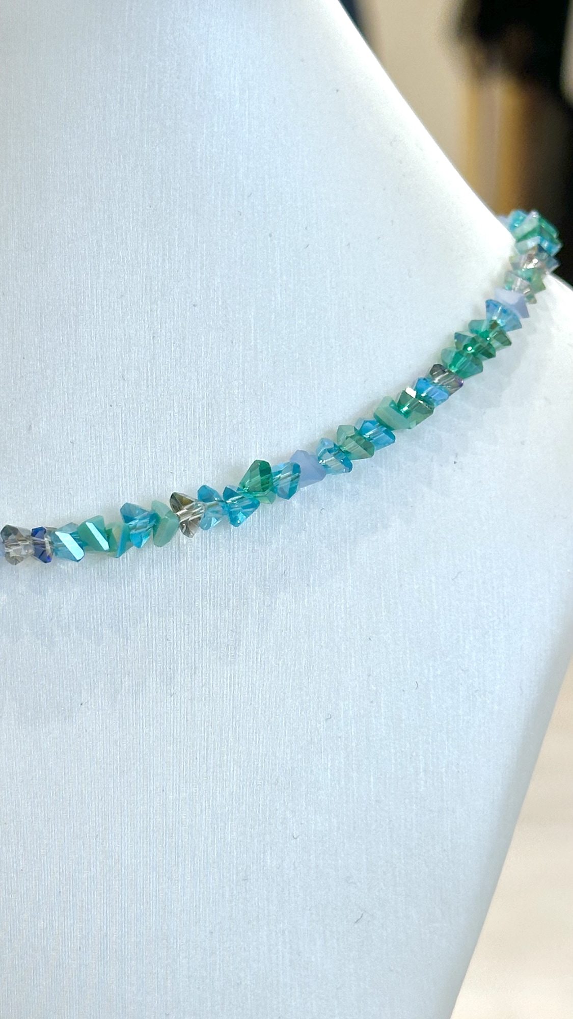 Collar en escallas de cristal en tonos celestes y verde agua.